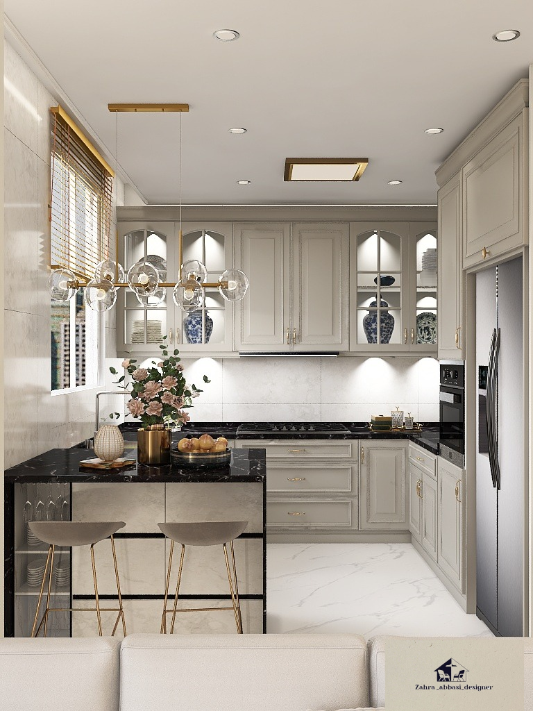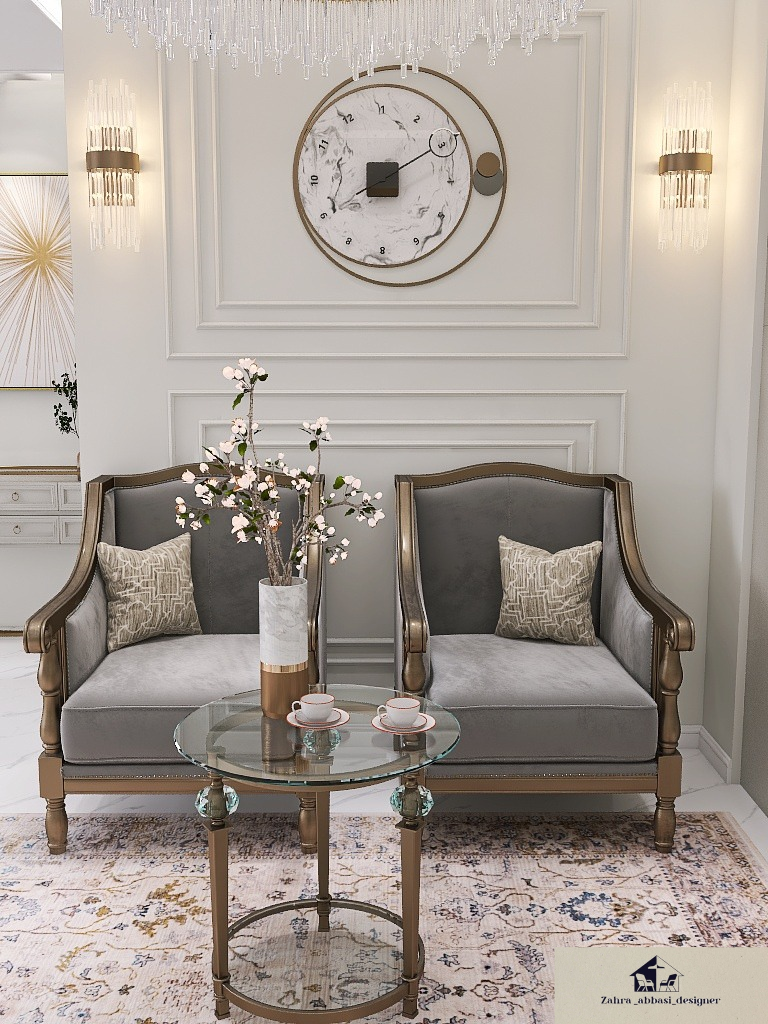 در جلسه سلیقهشناسی و انتخاب سبک، پس از بررسی دقیق علایق کارفرما و سبک زندگیشان، سبک نئوکلاسیک بهعنوان سبک نهایی انتخاب شد. اما با توجه به متراژ محدود خانه، تصمیم گرفته شد در طراحی داخلی از رنگهای خنثی و نود استفاده شود. برای جلوگیری از یکنواختی، عناصر طلایی بهعنوان جزئیات ظریف و رنگ آبی به میزان محدود در اکسنتها به کار رفت تا ترکیبی متعادل، شیک و ماندگار ایجاد شود.