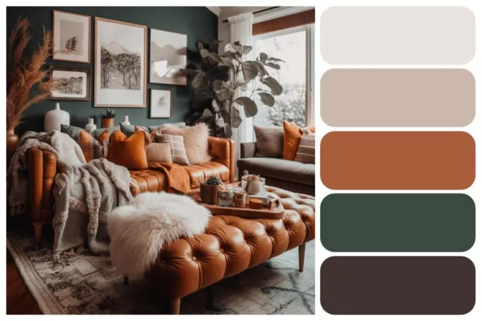 ترکیب قهوهای تیره و رنگهای خاکی در این پالت رنگی، فضای اتاق نشیمن شما را خنثی و آرام میکند. رنگهای نرم در تضاد با قهوهای گرم، حس راحتی و آرامش را به فضا میدهند.